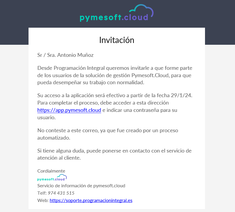 ¡IMPORTANTE! El resto de usuarios, consiguen el estatus de usuario de la cuenta, a partir de un proceso de invitación que pone en marcha la persona que actúa como Administrador de la cuenta del cliente. (Contacto administrativo que se indicó al contratar la suscripción). Esta persona, básicamente registra en el sistema a las personas, notificándoles mediante correo electrónico, que han sido designadas para utilizar la aplicación.